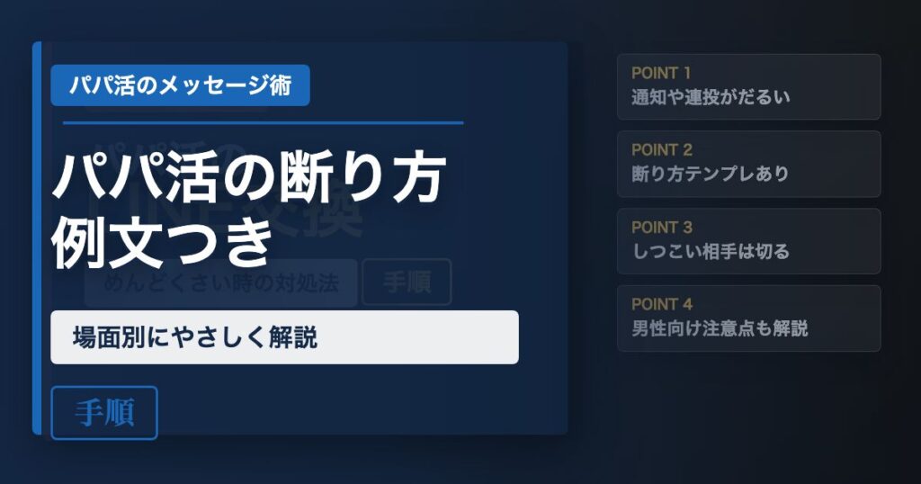 「パパ活で断りたい場面があるけれど、感じ悪くなりたくない…」「大人や写真を求められた時、どう返せばいいかわからない…」「2回目を断りたいのに、言い方が浮かばない…」と悩んでいませんか。 パパ活では、始め方や条件の出し方より、断り方の方がずっと... -