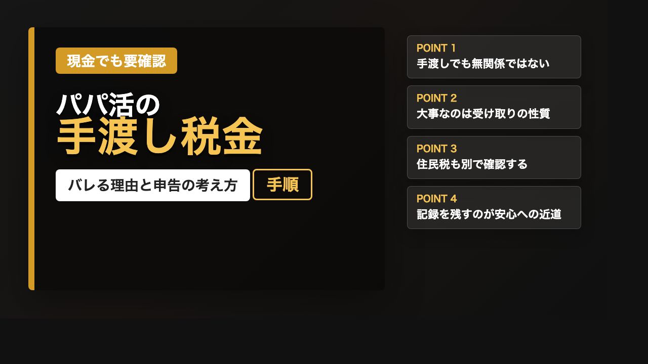 いかがでしたでしょうか?パパ活の現金手渡しで大切なのは、「現金だから税金は関係ない」と短く考えず、何のお金かを分けて整理することです。