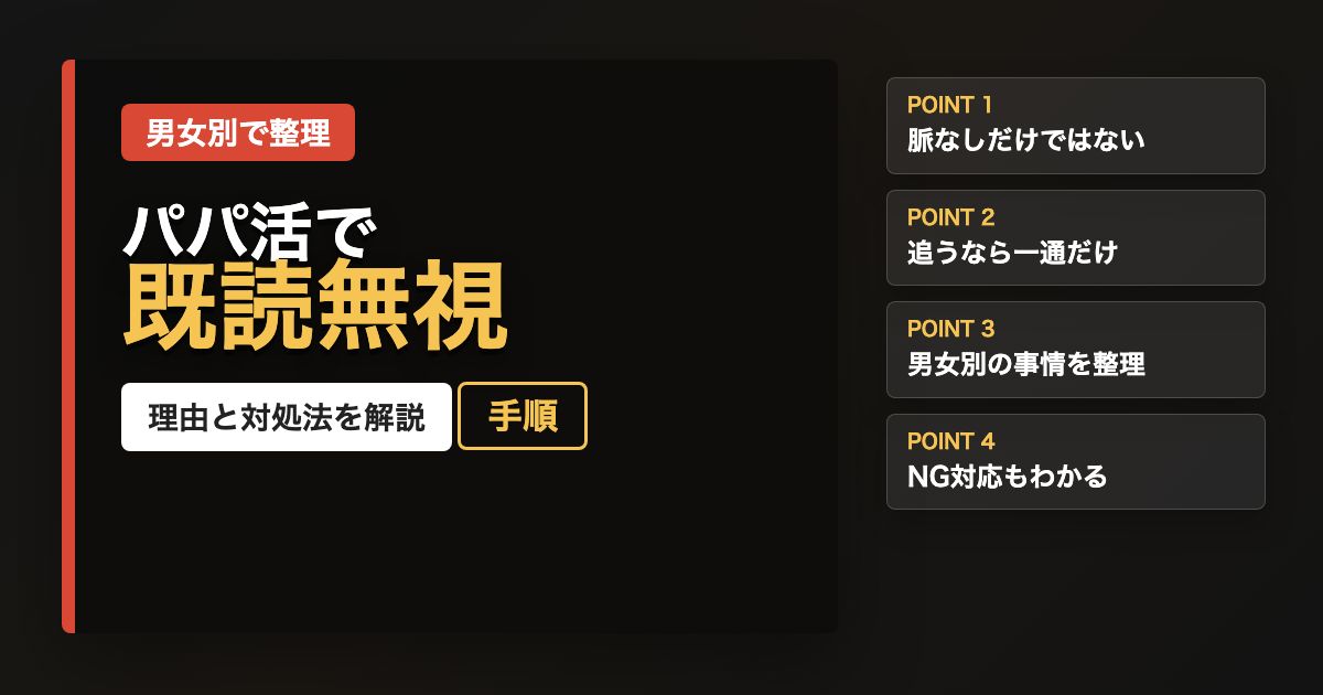 この記事では、パパ活で既読無視が起きる理由、女性側・男性側それぞれの事情、追っていい一通と送らない方がいい一通、切り替える判断までまとめて解説します。