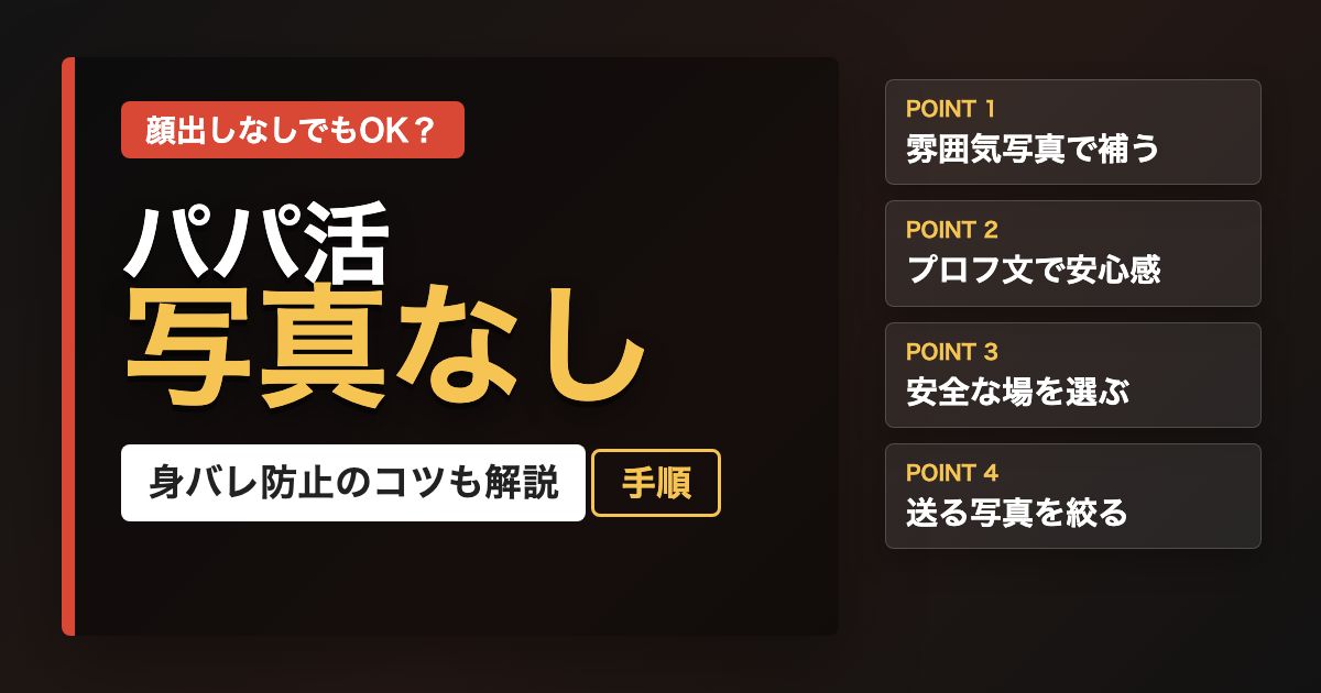 本記事では、パパ活で写真なしはどこまで不利なのか、顔出しなしで使いやすい写真の選び方、身バレを防ぐプロフィール作り、安全なサービス選びまでまとめて解説します。