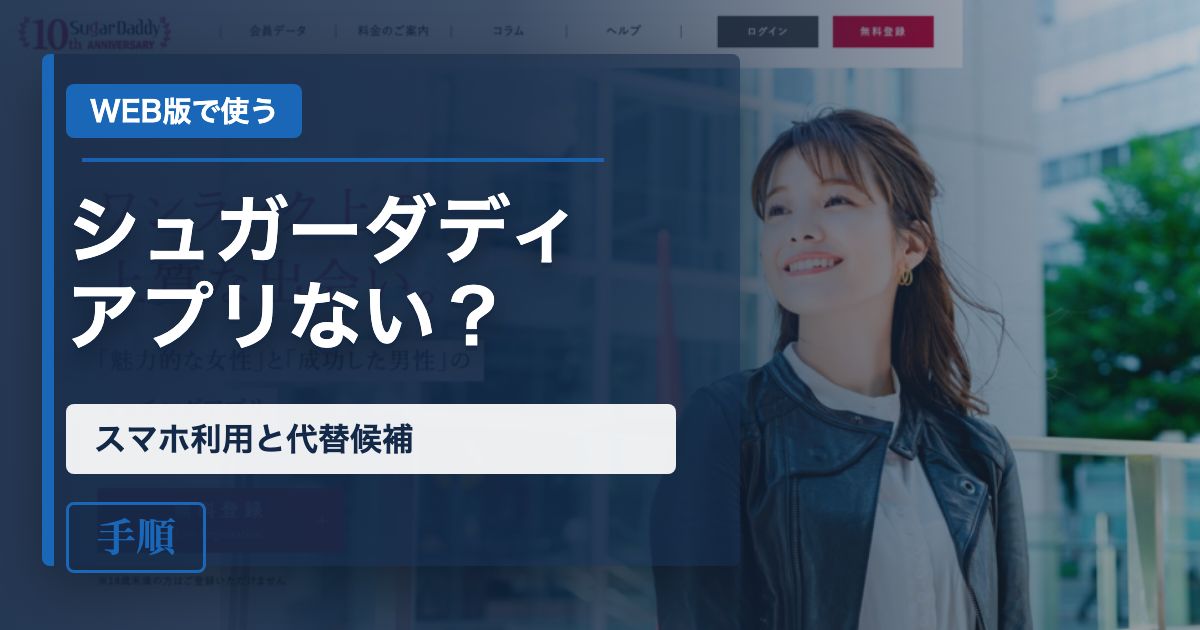 シュガーダディは、少なくとも2026年4月11日時点で筆者がApp StoreとGoogle Playを確認した限り、公式アプリを見つけられませんでした。今の前提は「WEB版で使うサービス」と考えておくと分かりやすいです。